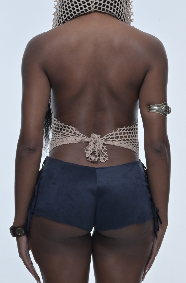 stretch suede fabric with a satin lining, front zipper closure & fringe detailing.